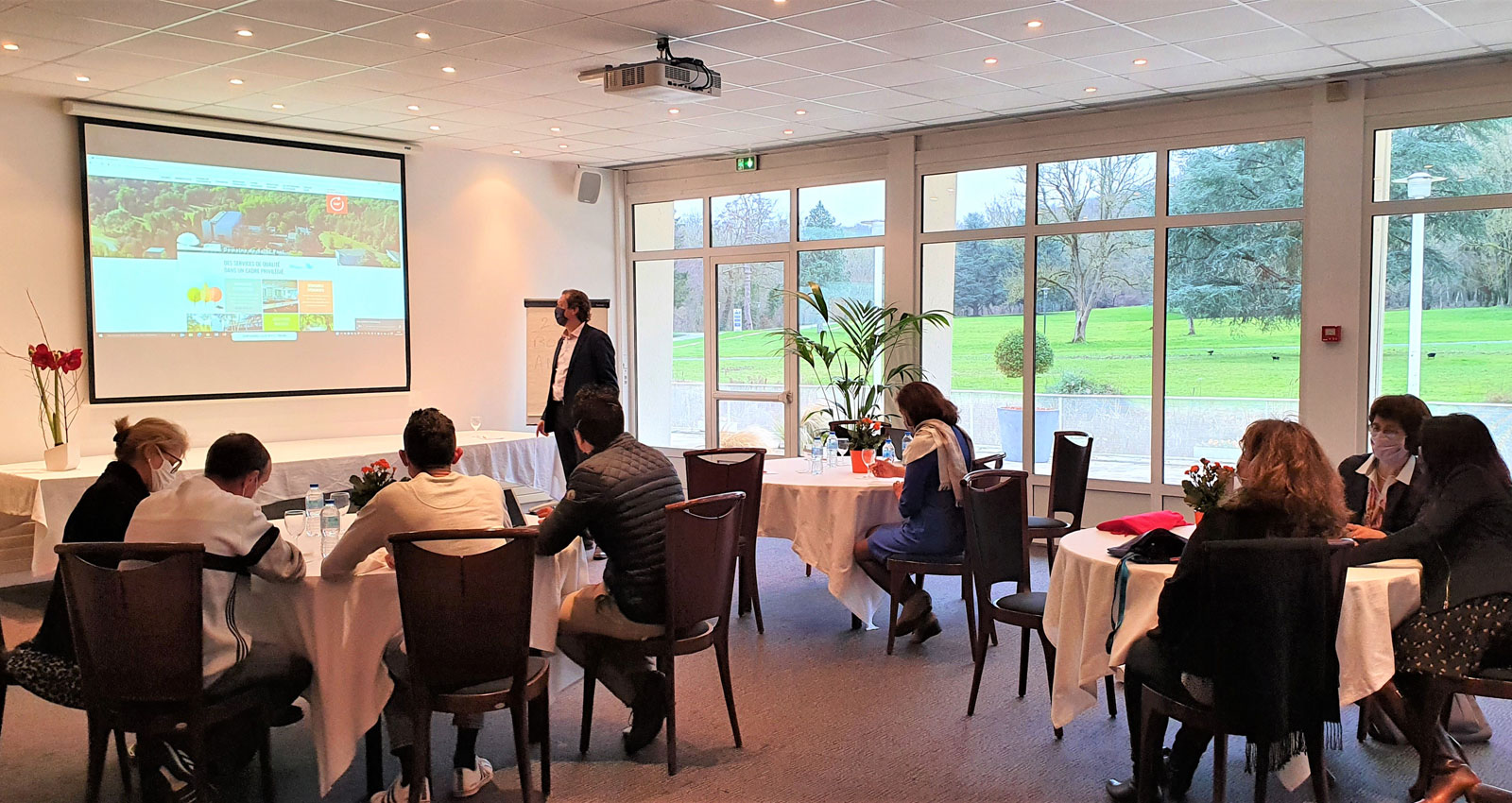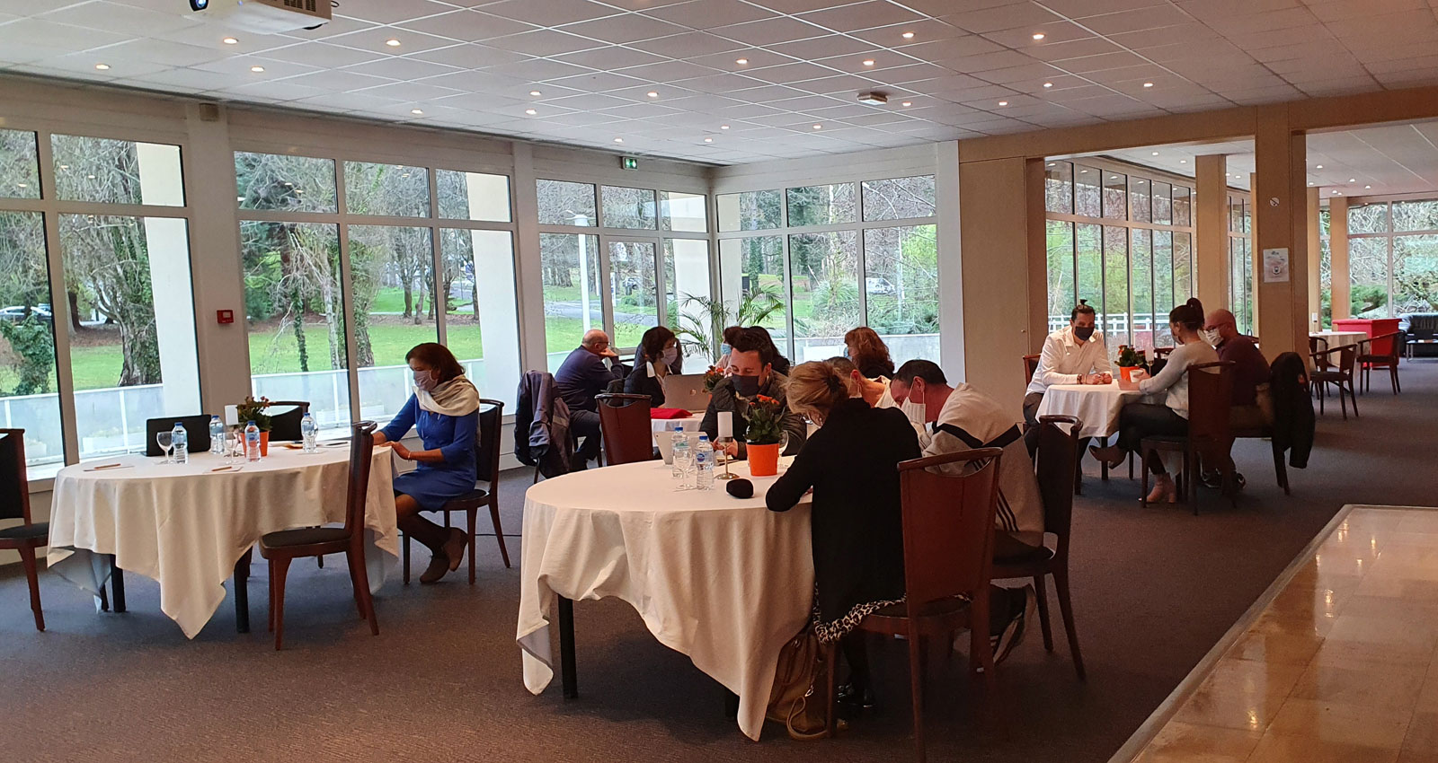 – un espace de travail type cabaret avec tables rondes, équipe de vidéo projection … : un environnement plus convivial que la traditionnelle organisation « salle de classe » ;